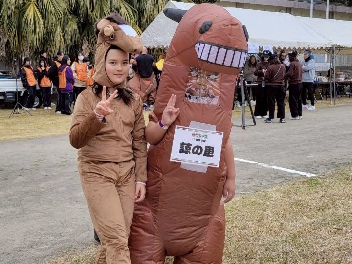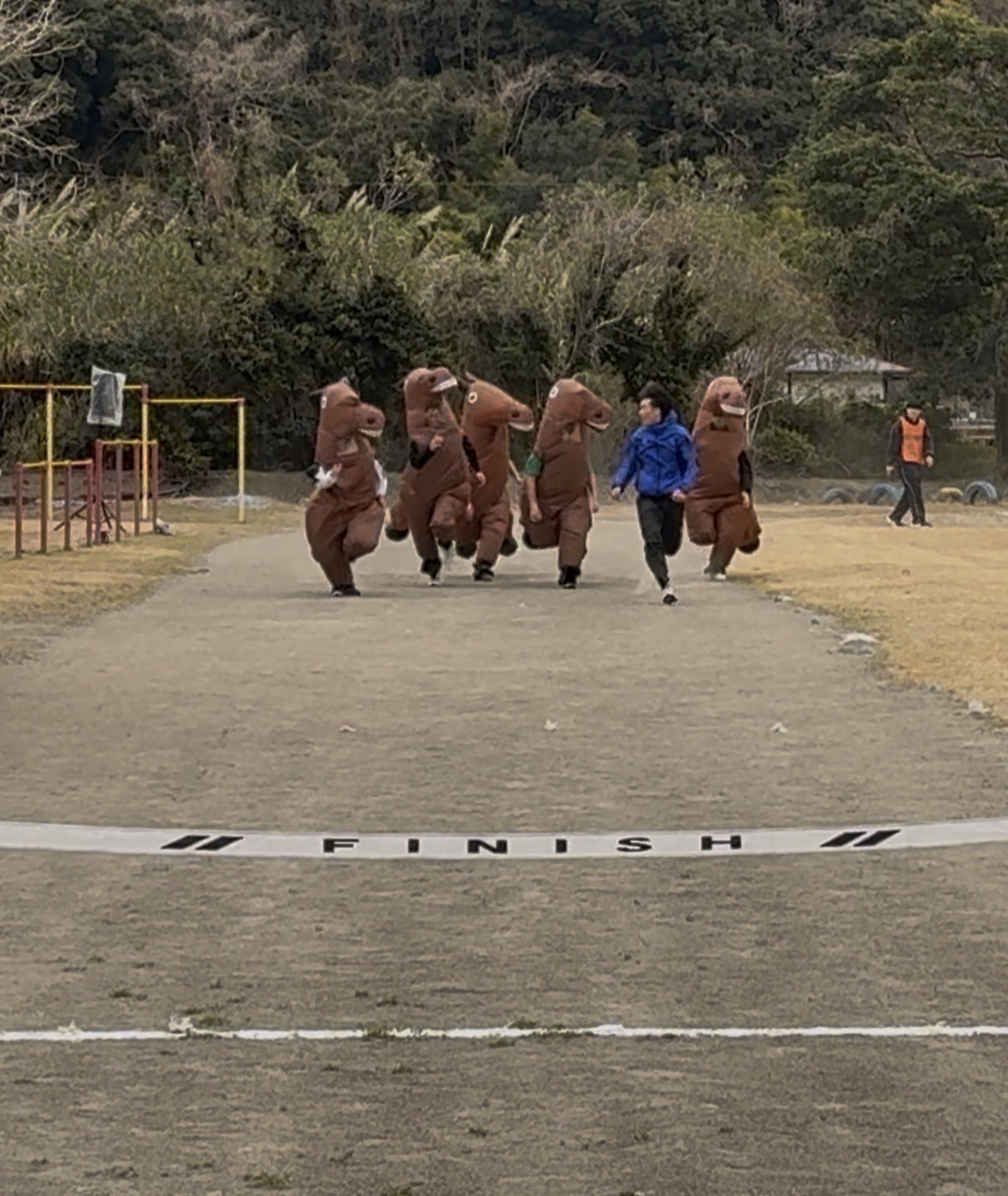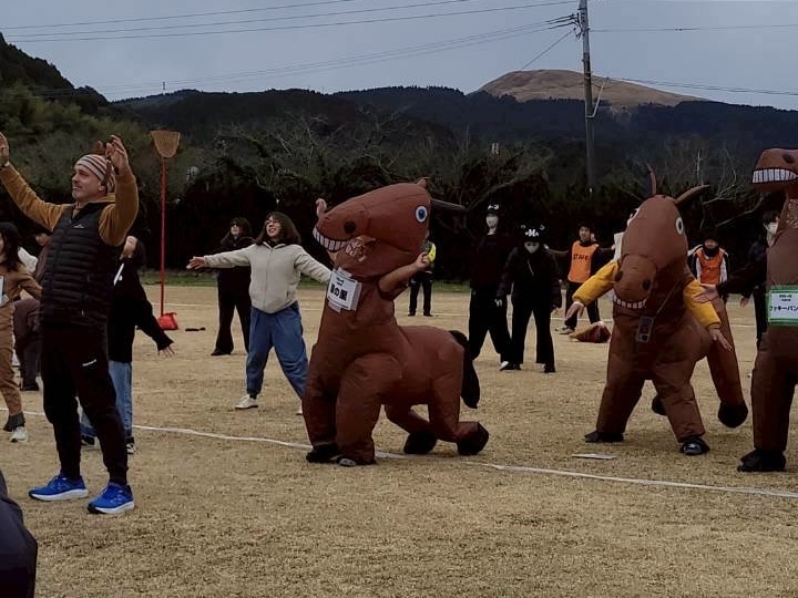 2023年頃から恐竜の着ぐるみを着て走る「ティラノサウルスレース」が、日本各地で急速に人気が高まり始め、公式の初レースが2024年7月に長野県上田市で開催されました。その話を聞いて、ぜひ串間市でも!と思ったのですが、串間市で恐竜イベントをやる理由が見つからない…。待てよ、馬の着ぐるみはないのかい?とAm◯zonを調べたところ、あったー!そこからやるまでは早かったですね!「都井岬ウマリンピック世界大会」として、第1回目を2024年11月に開催をしました。